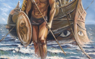 Во время переправы Ясон теряет одну сандалию и так приходит к дяде-узурпатору Пелию. Тот, увидев героя, пугается, потому что предсказано, что Пелия сгубит человек, который явится к тому в одной сандалии. Пелий спрашивает Ясона, кто тот такой, и герой отвечает, что он — сын Эсона, свергнутого царя, и пришел вернуть законную власть отцу.