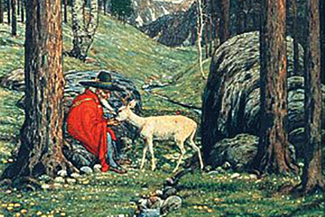 - Внешность Гэндальфа позаимствована Толкином с почтовой открытки. На картинке под названием «Горный дух» изображен пожилой бородатый мужчина с деревянным посохом. Дух одет в остроконечную шляпу и кормит с руки олененка.